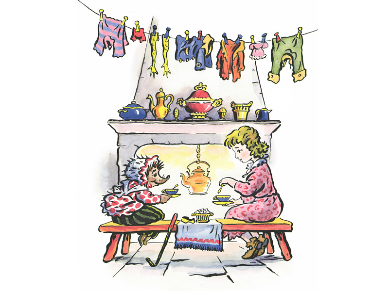 Наконец, все постиранные вещи разобраны, и героини садятся пить чай: «Пьют и друг на дружку поглядывают», – но Люси все же отсаживается подальше, ведь сквозь платье и чепчик Ухти-Тухти торчат острые иголки. Напившись чаю, Ухти-Тухти с Люси выходят на тропинку и раздают зверям их чистые выглаженные «платьица, или штанишки, или белье». Но когда Люси хочет попрощаться с Ухти-Тухти, та вдруг со всех ног бежит в гору, только уже без одежды: «Какая она вдруг стала маленькая-маленькая, коричневая, вся покрытая иголочками!.. Ну совсем как...» – и слушатели, конечно, подсказывают: «Ежик!»