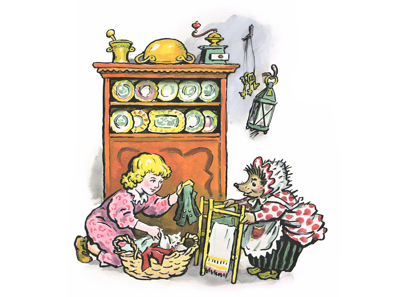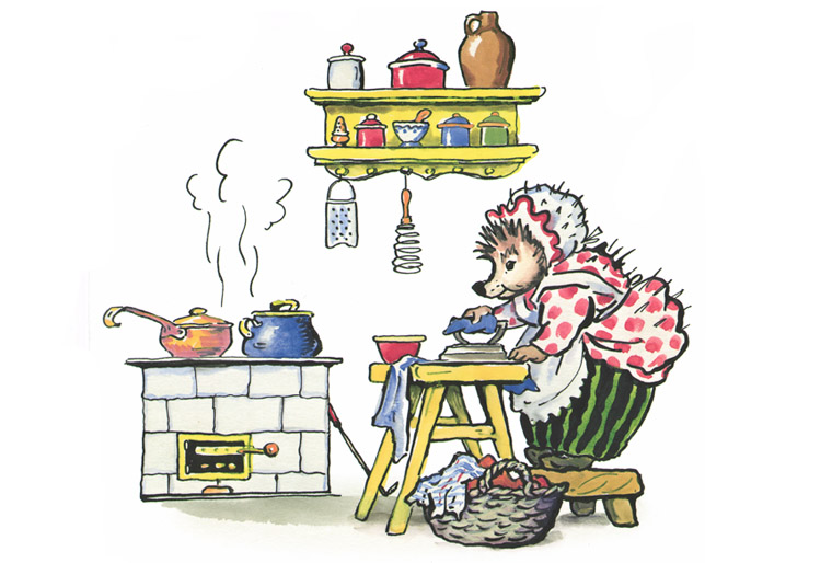 Девочка стучится в дверь и заходит. Автор ведет диалог с читателем: «Угадайте, что же она увидела?» Дети предполагают: «Енота-полоскуна!.. Приборы для стирки – ну, тазы, там, что-то еще…» Не совсем так: «это прелестная чистенькая кухонька», только с очень низким потолком. А возле гладильной доски стоит кругленькая коротышка: «Маленький черный нос пыхтел: “Тух-тух-тух”, черные глазки сверкали, как бусинки. На голове был чепчик, из-под которого почему-то торчали иголочки», – так мы знакомимся с главной героиней.