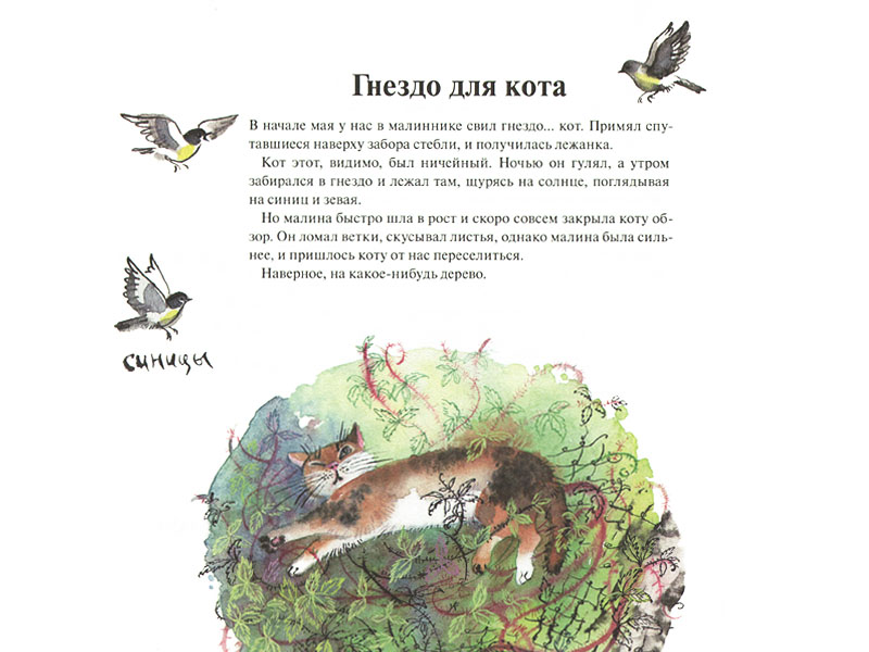 Именно эти рассказы больше всего запомнились Федору. Он пересказывал их своим бабушкам и радовался тому, что те удивляются и смеются. В основном книга состоит из небольших лирических зарисовок «ни о чем», но и они вызвали живой интерес у Федора. Притихнув, он слушал, как кот устроил себе «гнездо» в малиннике, как «вроде бы овчарка» по кличке Бой преследовал соседскую курицу, как дрозд – «хвост торчком, грудь колесом» – объел в огороде последний куст черноплодки…