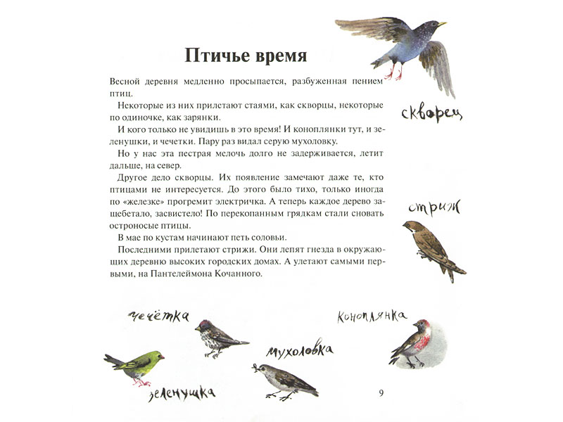 Издатели утверждают, что «Кум Королю» – книга о птицах. Сколько их тут! Зарянка, коноплянка, чечётка, сойка, дубонос, щегол, соловей, желна… И все они изображены художницей Верой Цепиловой подробно и точно, но не без изящества. Пришла весна – «птичье время», – и Федор загорелся желанием увидеть синекрылую сойку.