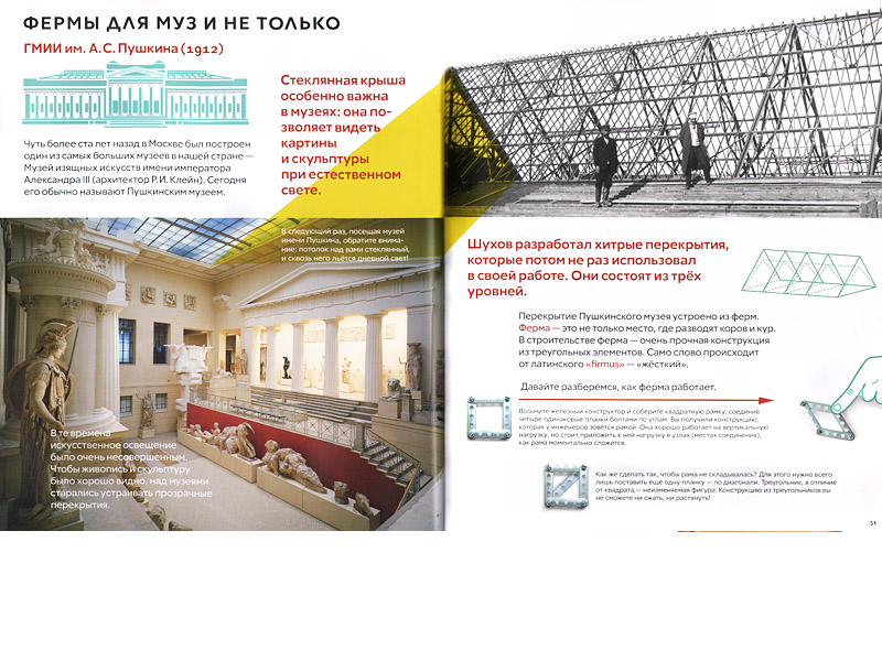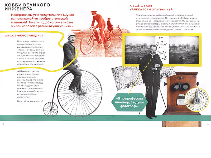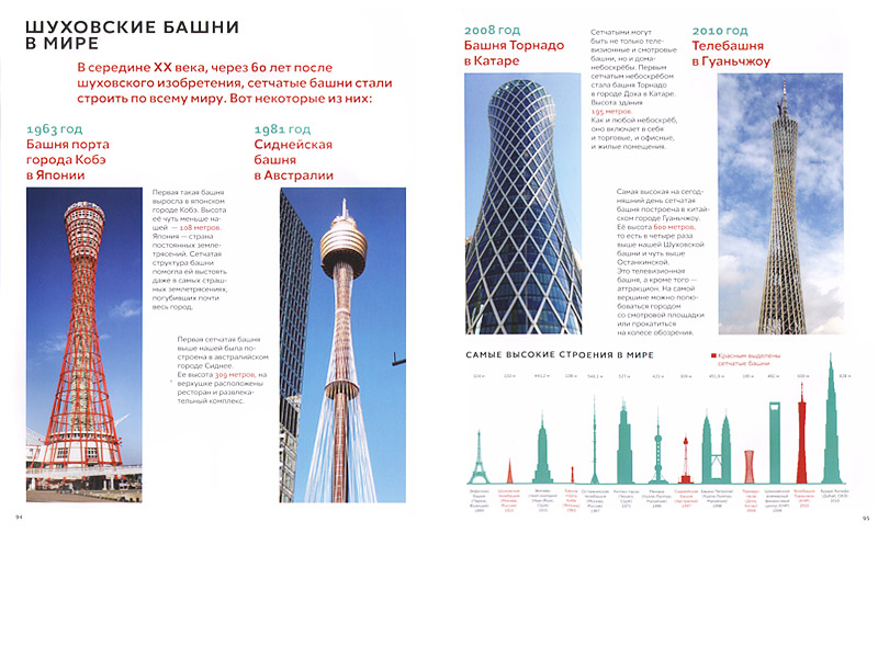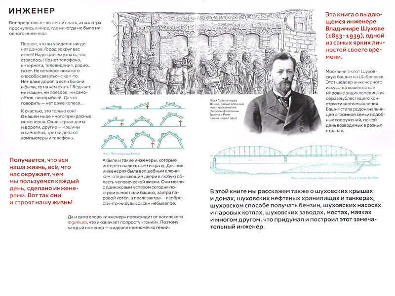 В книге описываются не только придуманные Шуховым технические приспособления, но и принципы их действия. Например, просто и понятно объясняется устройство «фермы» (в строительстве ферма – очень прочная конструкция из треугольных элементов), рассказывается, как этот великий инженер додумался до конструкции танкера, сетчатой ретрансляционной башни и других своих знаменитых изобретений. Нет, скорее произведений. Ведь Шухов относился к инженерному делу как к искусству.