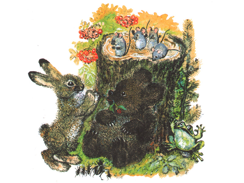 А еще в книге есть сказка «Теремок». В исполнении Чарушина эта сказка превратилась в гениальное произведение для малышей – тех, кто только учится слушать сказки. Что же он сделал?