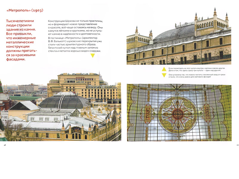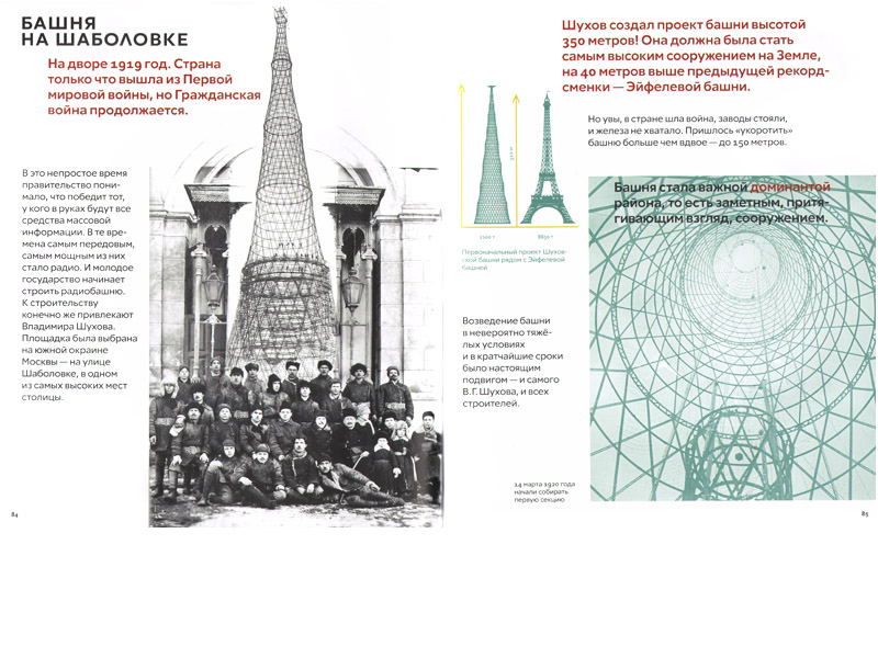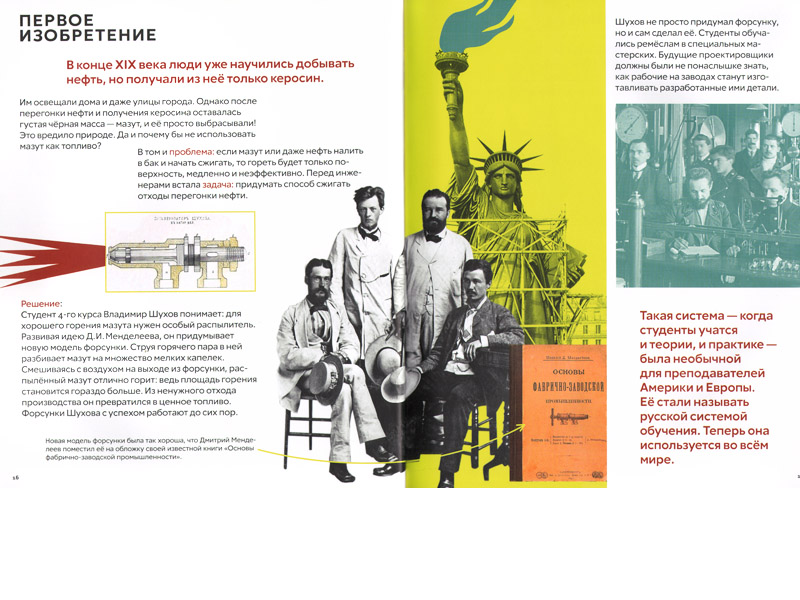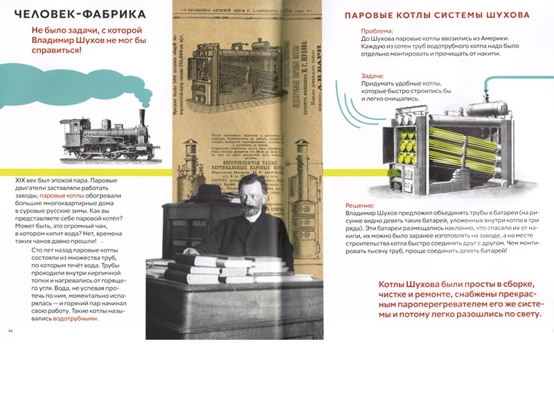 Оказалось, что инженер ‒ это человек, который, выполняя технические задания, постоянно разрешает противоречия. Как сделать конструкцию кровли или моста одновременно и легкой и прочной? Как заставить нефть подниматься по трубопроводу вверх? В книге «Что придумал Шухов» это показано очень наглядно. Перед описанием каждого изобретения, каждой новой модели очень четко указана задача, которая стояла перед инженером В. Г. Шуховым и которую ему требовалось разрешить. (Тут трудно не согласиться с афоризмом «Правильно заданный вопрос ‒ уже половина ответа», ведь от правильной формулировки задания зависит, можно ли его выполнить вообще.) Затем в книге описывается придуманный Шуховым способ решения изобретательской задачи и чем этот способ отличается от того, как разрешались эти технические противоречия раньше. Получается, что инженер ‒ это творец, который, создавая что-то новое, меняет окружающий мир. И создавая свои знаменитые и используемые по всему миру сетчатые структуры, Шухов думал не только о стоящей перед ним технической задаче ‒ сделать одновременно более легкую и более прочную опору для строительства мостов, конструкций кровли и башен, но и одновременно разрешал эстетическую задачу. Эти конструкции должны быть красивыми. У Шухова получилось создать металлические сетчатые конструкции, которые, несмотря на их неоспоримую прочность, кажутся практически невесомыми, воздушными, кружевными, ажурными. Вспомните Шуховскую башню на Шаболовке в Москве, конструкции крыши ГУМа или ГНИИ им. А. С. Пушкина.