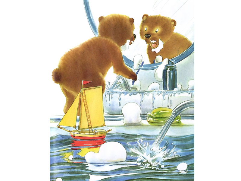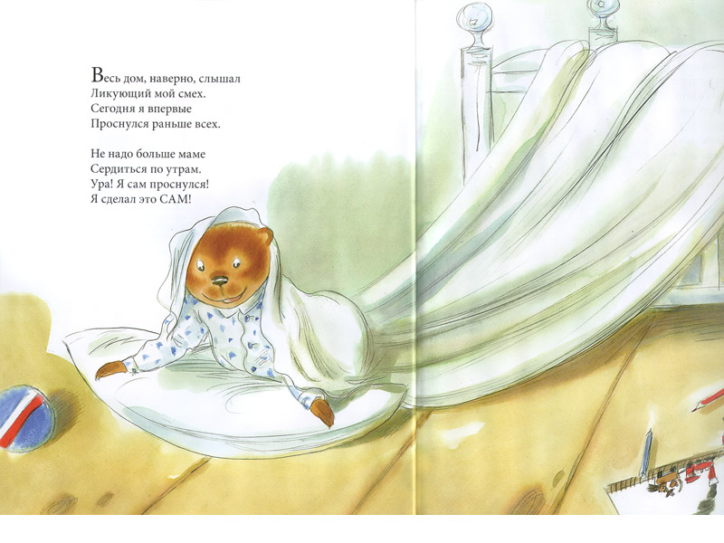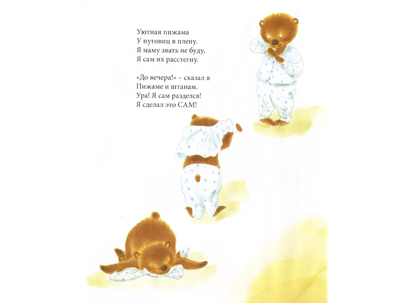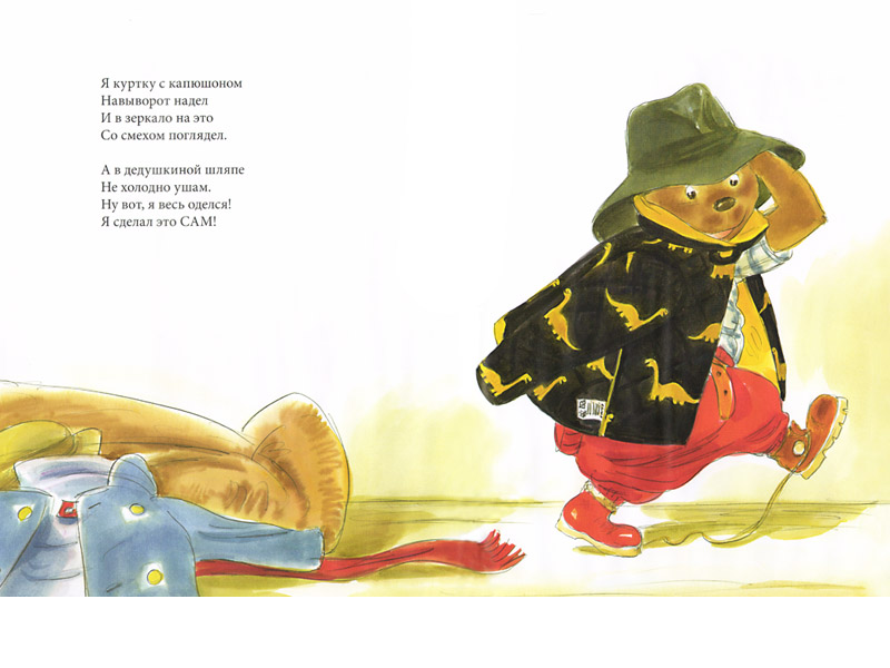 Это магия слов. Но если бы все ограничилось этими словами или короткими подписями вроде: «Я сам оделся», «Я сам почистил зубы» и каким-нибудь «выводом», например: «Теперь я все делаю сам», то и говорить было бы не о чем. Мы бы получили книжку-картинку, в которой текст есть, он – важная составляющая книги, но при этом играет подчиненную роль.