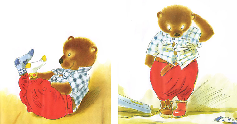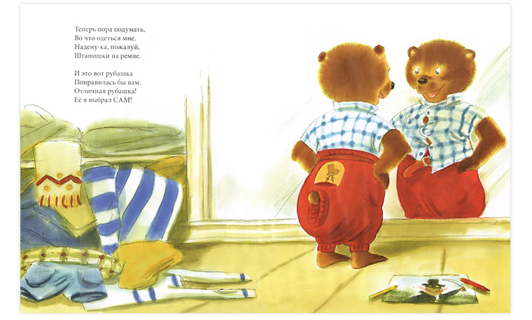 Но картинки только «фиксируют» действия: вот так медвежонок одевается, вот что у него получается. Картинки можно разглядывать, отвечая на вопрос «Что делает медвежонок?». Однако захватывающую остроту картинкам придают слова «я сам»: они «разворачивают» восприятие, побуждают рассматривать книжку «в контексте проблемы»: медвежонок не просто что-то делает, он делает это САМ. Поэтому результаты его деятельности местами такие странные – разные носки на лапах, непарная обувь на лапах, и т.п.