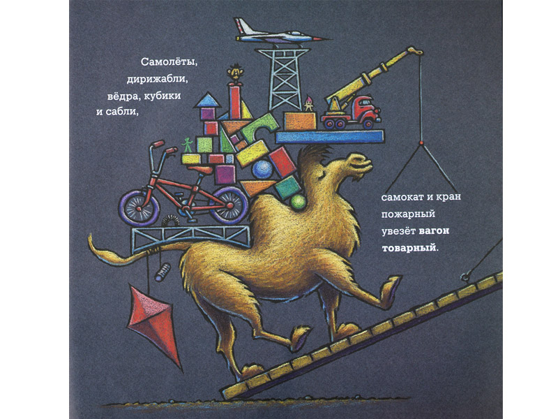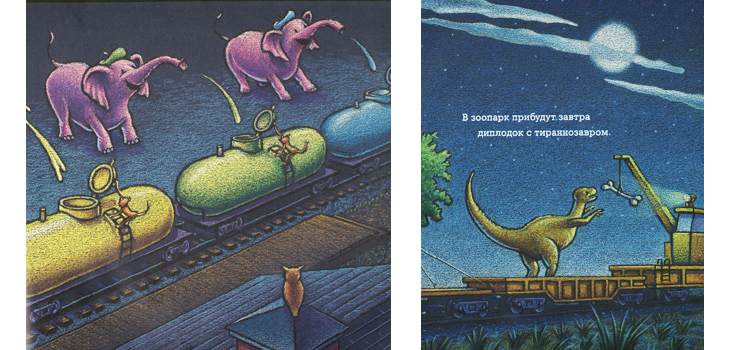Я тоже обрадовалась – неслучайности первых же картинок, с которыми столкнулся ребенок, опоре на его непосредственный игровой и житейский опыт. И подумала с облегчением: похоже, нам попалась очень правильная детская книжка. Вагоны разной формы и цвета немедленно вызовут кучу вопросов, а динозавры и жирафы вообще, по-моему, не оставляют равнодушными ни одного малыша. Впрочем, как и слоны, которые тоже в изобилии обитают на страницах.