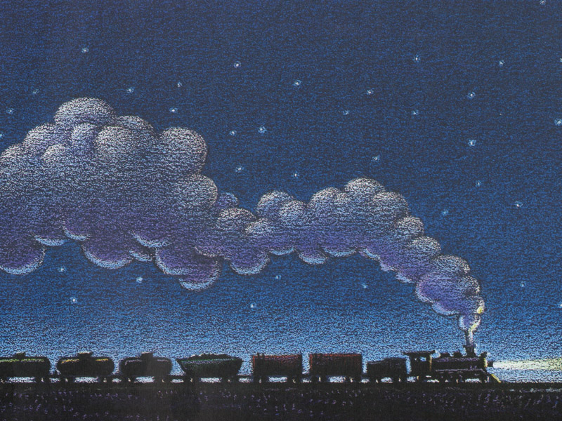 Недавно нам подарили паровозную сказку для четырехлетнего Мити – «Чудный поезд мчится в сон», свеженькую, только из типографии. Авторы были нам совершенно неизвестны, а сюжет предельно прост. Под синим ночным небом из пункта А в пункт Б мчался паровоз с множеством разномастных вагонов, окутанных шлейфом дыма. В одном из вагонов ехали динозавры, из другого торчала шея жирафа. В конце захватывающего путешествия огромный поезд превращался в игрушечный состав, который дремал у кровати маленького мальчика.