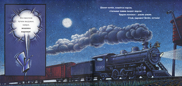 Ну, и наконец самое неожиданное – сказочная колыбельная сумела удовлетворить бесконечно растущие познавательные запросы моих детей. Ребята насчитали больше пятнадцати специальных «паровозных» терминов, названий разных вагонов. А поскольку все они замечательно проиллюстрированы, то теперь мальчишки точно никогда не спутают цистерну с платформой или рефрижератором.