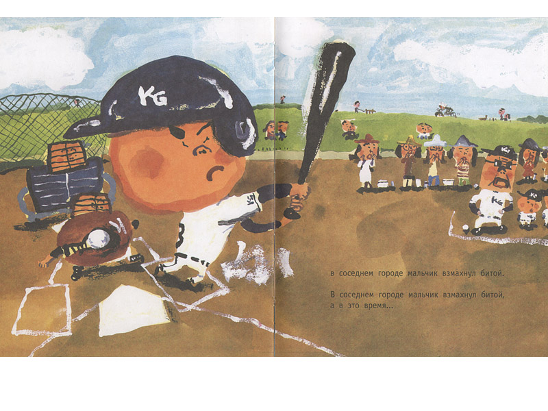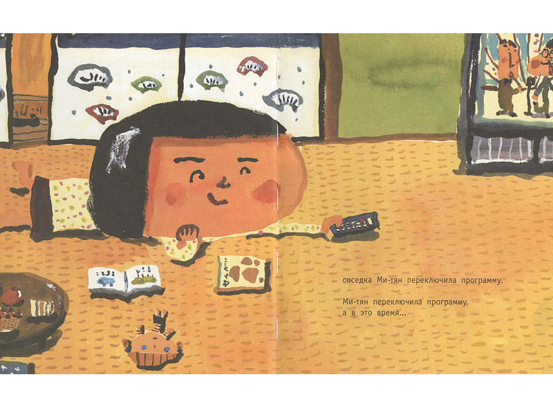 На каждом развороте ‒ большая иллюстрация, показывающая действие ребенка, каждый раз нового, и две коротких фразы, частично повторяющие друг друга: «Соседка Ми-тян переключила программу. Ми-тян переключила программу, а в это время...» Сначала персонажи – соседи, потом – жители соседних домов, соседних городов, соседних стран. Дети улавливают однообразность повествования, передразнивают автора: «А в это время, а в это время… А в это время в соседней галактике!.. в соседней вселенной!..» Поначалу они очень внимательны. Каждый разворот вызывает хихиканье; забавляют те или иные детали: тут кошка зевает, а вот корова смешная. Взрыв смеха вызывает разворот, на котором «сосед соседки Тай-тян спустил в туалете воду», – где ж это видано, чтоб в книжке про туалеты писали и рисовали! Но постепенно монотонность повествования и отсутствие сюжета утомляют читателей. Тем не менее многие дети по-прежнему внимательно рассматривают иллюстрации, иногда отмечая какие-то детали («А эта девочка – в платке»), хотя можно услышать и разочарованное: «Я думал, интереснее будет».