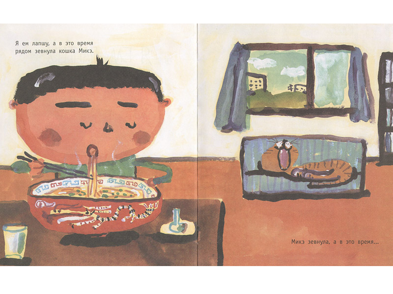 Предлагаю будущим слушателям две книги о разных странах: «Как я стал путешественником» Федора Конюхова и «Я ем лапшу, а в это время...» японца Ёсифуми Хасэгава. Показываю обложки, иллюстрации внутри, вкратце рассказываю о каждой. Мнения разделяются, но большинство выбирает «про лапшу». Интригует многоточие в заголовке и работа художника: «Интересно, что же происходит “в это время”… Я люблю лапшу!.. Здесь картинки выглядят более современными!»