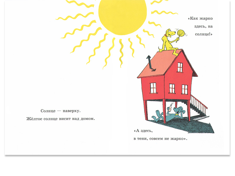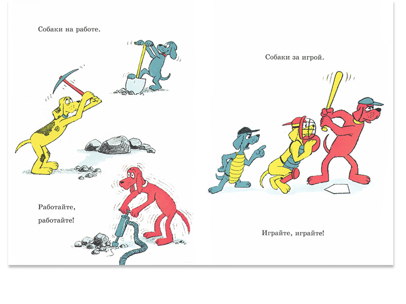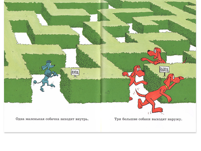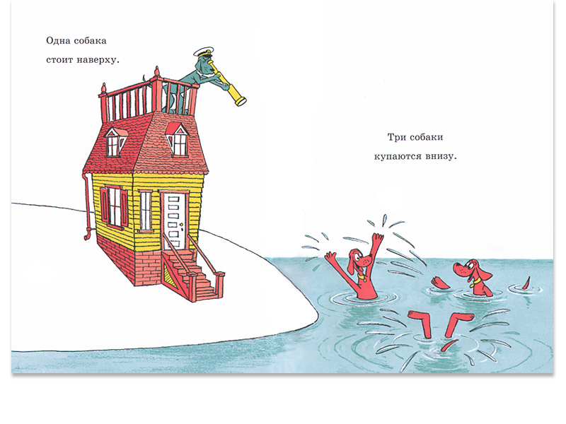 И вся эта восхитительная, «вперед! вперед!» несущаяся бредятина прямо-таки нафарширована всевозможной «полезной информацией»: тут тебе и сравнение по величине (собаки большие и маленькие), и усложненный подход к цвету (собаки черные, собаки белые и черно-белые), тут просто раздолье для освоения всевозможных пространственных предлогов («под», «над», «в», «из», «к») и пространственных наречий («наружу», «внутрь», «наверху», «внизу»), и, естественно, счет (считать собак не пересчитать).