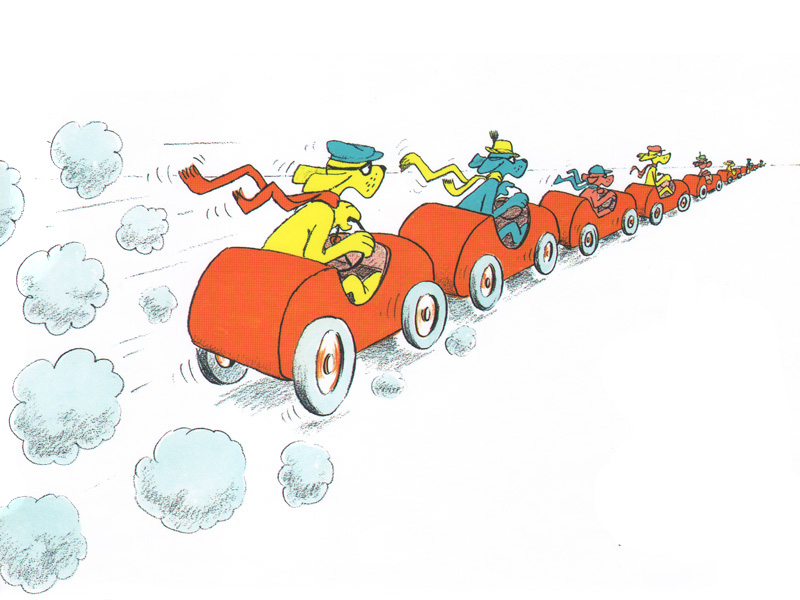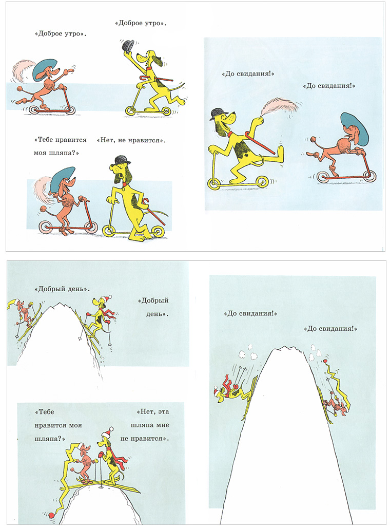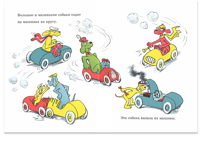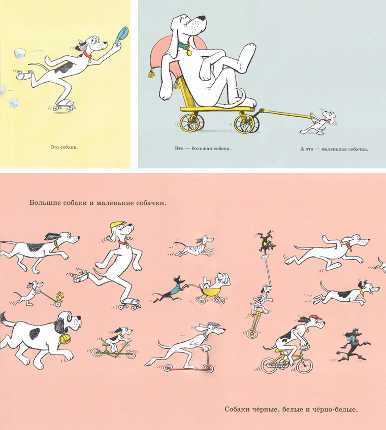 На самой первой странице нам показывают собаку и сообщают: «Это собака». Но она не сидит, не лежит, даже не просто идет: она едет на роликах. На следующей странице опять собаки и опять в движении: маленькая собачка пытается везти на тележке большую собаку. Дальше движение ускоряется: тут много разных собак, и все они куда-то несутся-едут. Собаки Истмена самым фантастическим образом вписаны в мир современной цивилизации: почти на каждом развороте есть какое-нибудь механическое средство, которое они используют, чтобы передвигаться.