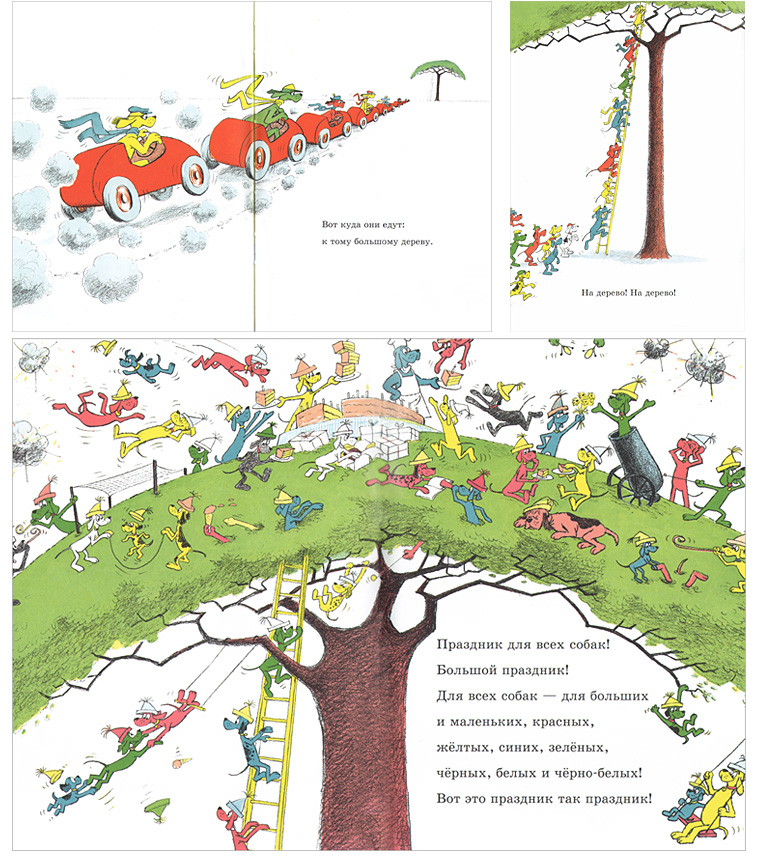 А уж что эти собаки выделывают во время праздника на верхушке дерева! Они такое выделывают, что хотелось бы выделывать и самому ребенку. Они там «бесятся» ‒ скачут на батуте (и так высоко подпрыгивают, что даже немножко летают), они едят торт и мороженое, они ныряют в листву и там прячутся. И можно долго-долго разглядывать эту «праздничную» картинку и обнаруживать «части» спрятавшихся собак.