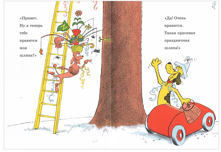 Такой поворот дела приводит детей в восторг. Это, правда, не совсем неожиданность. Собаки Истмена то и дело оказываются на деревьях. Они там сидят и лежат, испытывая самые разные эмоции. Вообще-то, даже трехлетний малыш уже знает, что такого не бывает. Да и деревьев таких не бывает. Но собаки на деревьях – это такая «книжная реальность», с которой ребенок радостно соглашается. Но это всего лишь доказывает его первоначальную догадку, что «собаки смешные».