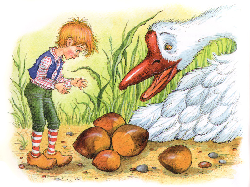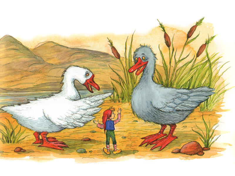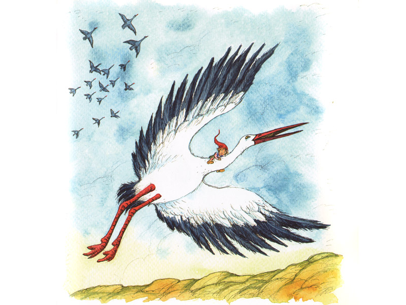 За Нильса дети ужасно переживали, моментально выучили наизусть все трудные имена героев, обсуждали, играли в них. Примечательная история случилась, когда, взявшись за рассматривание любимых книжек Сюзанны Ротраут Бернер (Весенняя и Осенняя книги), дети обнаружили там… стаю Акки Кнебекайзе. Оказалось, что в книгах Бернер можно найти почти всех героев книги Лагерлёф (разве что кроме самогó уменьшенного мальчика ‒ но «большой» Нильс там тоже есть): путешествующих стаей гусей, аиста Эрменриха, лиса Смирре… Дети разглядывали картинки маленькими компаниями, рассказывали, что там происходит сейчас, что-то вспоминали из прочитанного и придумывали новые приключения. Со мной тоже делились: «Оля, смотри, и тут стая Акки Кнебекайзе летит!.. Вот лис Смирре! И тут, и на этой странице!.. А вот аист Эрменрих несет Нильса. Ну, вернее, лягушонка, просто Нильса маленького тут не нарисовали, но несет-то он его, как Нильса, за шиворот!» В книге Лагерлёф описывалось, как аист непривычно и неудобно для Нильса подхватил его за шиворот, а на гусе Нильс летал верхом, ‒ дети запомнили и разглядели это в другой книжке… Вот это погружение!