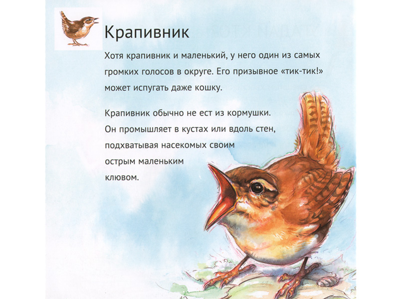 То, что книга адресована именно таким детям, подчеркивается имеющимися в ней приложениями: в конце есть «Птичий словарик», где объясняются использованные «термины», – т.е. все серьезно. Например, кормушка – это «коробочка или дощечка, расположенная под крышей, с семенами и орехами для птиц». Заметьте: хлебные крошки здесь не упоминаются.