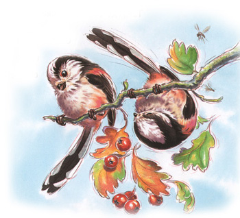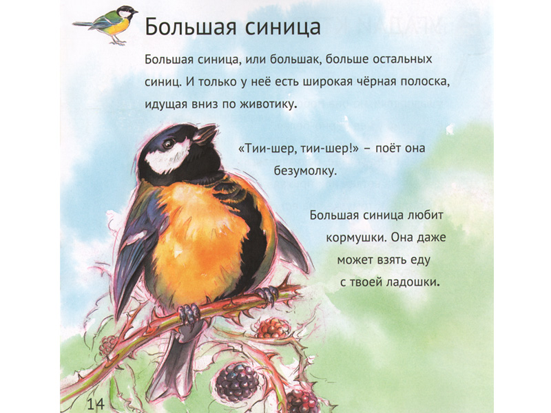 Каждая птичка нарисована здесь крупно и, что важно, в движении. Это важная особенность книги. Авторы не просто описывают внешний вид синицы или малиновки, но и рассказывают о характерных для нее движениях и позах, о способах добывания пищи.