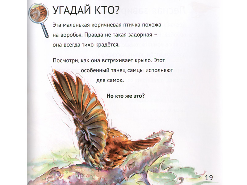 Рассказ о каждой птичке разбит на две части. Первая часть – «загадка». Она начинается словами «Угадай кто?».