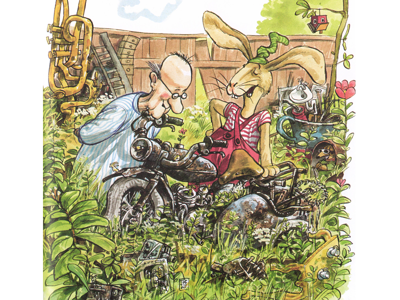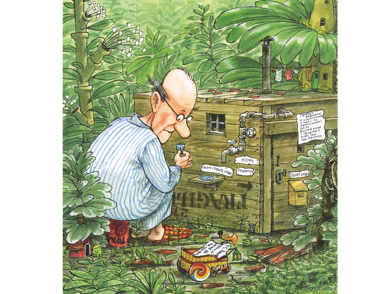 В том-то и соль, что он ее потерял. Раньше всегда ходил в шляпе, а тут проснулся – и нет ее. А он даже и не помнит, когда не носил шляпу: кажется, он носил ее всегда, и надел шляпу сразу, как только родился… Он отправился на ее поиски, даже не переодеваясь. Я читала книгу, а мои дети радостно обсуждали «привычные» нурдквистовские рисунки: низенький забор у дома курицы, гольф из клубков ниток, сарай с громадными железяками и мегарасческами с отломанными зубьями, и как на эти железяки вскарабкался дедушка, и громадные клубничины.