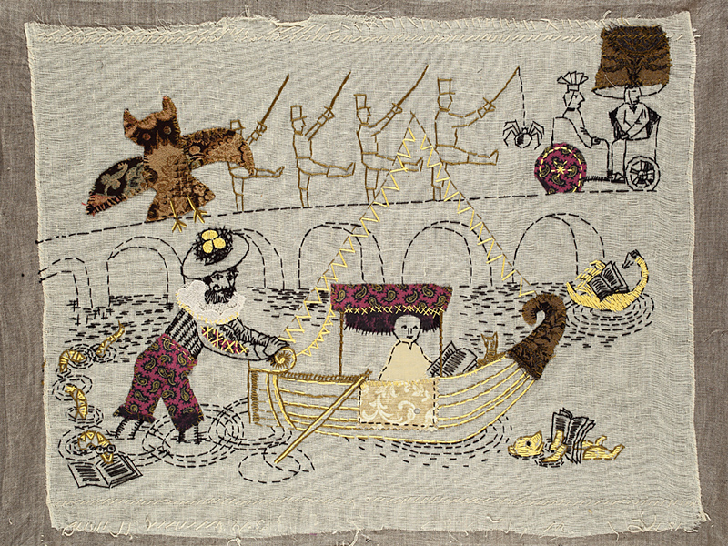 Тогда Артур сказал: давайте делать мою книжку. И не важно, сколько времени у вас на это уйдет. Я согласилась – хотя мы совершенно не понимали, кто из издателей захочет это издать. Остановились на сказках. Из-за того, что именно к сказкам можно было легко применить возможности текстильной аппликации. Не бояться богатства фактур, обилия цвета, вообще не жалеть изобразительных средств. Ведь в сказках возможно все что угодно ‒ и в смысле набора персонажей, и в возможностях интерпретировать сюжеты и по-разному оперировать пространством. Если в сказке «ЧП» все фигуры просто пасутся на траве, то в сказке «Концерт» изображение по графике ближе к афише, а в сказке «Переговоры» ‒ ближе к коллажу. Артур предоставил мне абсолютную свободу: могу шить, что хочу. И я этой свободой как могла воспользовалась. На обложке книжки ‒ ступени амфитеатра, маленький король под зонтиком, музыкант с дудочкой. Мне показалось, что они там совершенно уместны. Что они соответствуют духу книги. Хотя никакого короля с зонтиком в сказках нет. И трубадуров тоже.