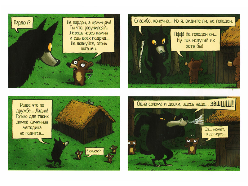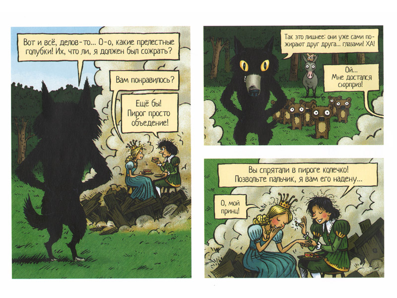 – Да, действительно можно сказать, что это хрестоматия сказок, и во Франции многие родители так и используют эту книжку. Но я совершенно не требую от детей знания всех сказок, достаточно, чтобы они узнали хоть одну. И тогда дети увидят, что сказка может быть представлена совсем по-другому, сюжет может быть закручен совсем иначе, не так, как они привыкли. Еще моя задача состояла в том, чтобы этой книжкой вернуть детей к исходному пониманию сказок. Сказки изначально рассказывались для того, чтобы подготовить маленьких детей к ужасному миру, который их ожидает, когда они вырастут. Эти сказки, связанные с брошенными детьми ‒ причем брошенными в буквальном смысле, выгнанными на улицу, ‒ они создавались в эпоху, когда были страшные периоды голода, людям было просто нечего есть. И дети должны были знать, что может так случиться, что в один прекрасный день с ними произойдет то же самое, что с Гензелем и Гретель или Мальчиком с пальчик. Сейчас во Франции нельзя рассказывать такие сказки, такие истории. Если расскажешь ребенку такую историю, то кто-нибудь немедленно вызовет полицию. Поэтому я беру эти старые истории с жутким содержанием и перекладываю их на современную эпоху, на тот мир, который мы видим сейчас, то есть адаптирую к моменту. Например, всеобщее современное состояние мира таково, что на нас будто бы наложили заклятье, которое прицепило нас к телевизору, как персонажей страшной сказки. И мы настолько оболванены этим телевизором, что не можем от него отойти, постоянно пребываем в полусонном состоянии, сидим и смотрим в ящик.