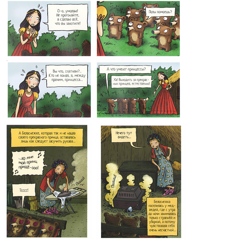 – А им больше ничего и не надо. Что, собственно, происходит в классической «Белоснежке»? Что Белоснежка делает у гномов? Она занимается хозяйством, уборкой. Она просто стала уборщицей. Да, она потом нашла своего Прекрасного принца. Но чем все это закончится? Подозреваю, что после такого «замечательного» подготовительного периода у гномов с принцем все окончится тем же самым. На самом деле, это сатира на то, как построено современное общество, в котором все разделены. Вот женщины, они занимаются тем-то. Вот мужчины, они хотят стать сильными. Женщины мечтают о Прекрасном принце, а мужчины мечтают, чтобы стать еще более сильными, и при этом всего боятся. И животные тоже не всегда бывают опасны. Вот волк здесь ‒ если он сыт, он может быть милашкой, ему совершенно не обязательно быть агрессивным и бросаться на всех.