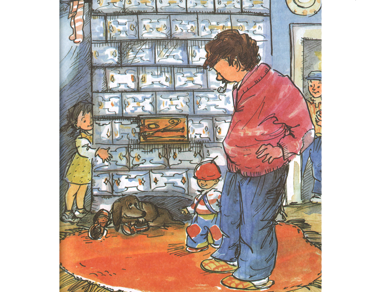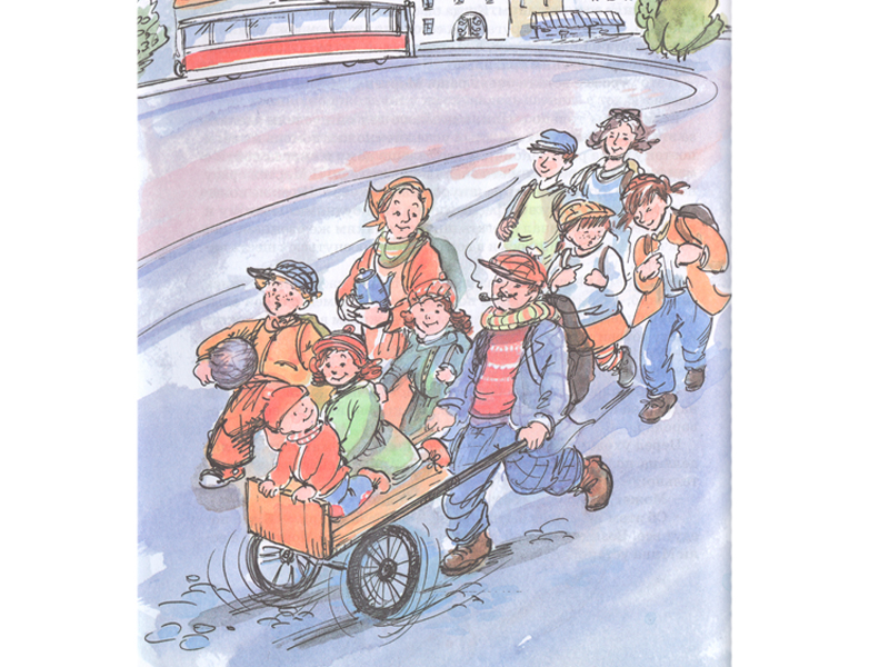 А вообще говоря, книжка «Папа, мама, бабушка, восемь детей и грузовик» совсем не философская, а очень-очень веселая, наполненная играми и выдумками. Например, имена всех детей в этой семье похожи на забавную считалку-скороговорку, они все начинаются на букву М. Кажется, будто мама затеяла очередную игру, когда она громко зовет детей к столу: « Марен, Мартин, Марта, Мадс, Мона, Милли,Мина, Мортен – обедать!» И что с того, что на обед у них часто только хлеб и картошка. Вся трудность жизни героев словно спрятана до поры от читателя за проделками Мортена и его братьев и сестер. А самые маленькие читатели, те, которые пока еще только слушают, вообще не замечают этих трудностей, не в силах оторваться от увлекательного текста. Они немножко завидуют Мортену, который выкрасил весь пол в комнате красной краской, и ничего ему за это не было. Волнуются – разрешит ли папа оставить найденную в лесу таксу, которой дети уже придумали смешное имя Самоварная Труба? Затаив дыхание, следят, как маленький Мортен помогает тушить пожар в доме по соседству, как бабушка защищает дом от разбойников, устраивая ловушку с ведром, – и с облегчением вздыхают, когда разбойники оказываются вовсе не разбойниками, а добрыми друзьями семьи, приехавшими в гости без предупреждения.