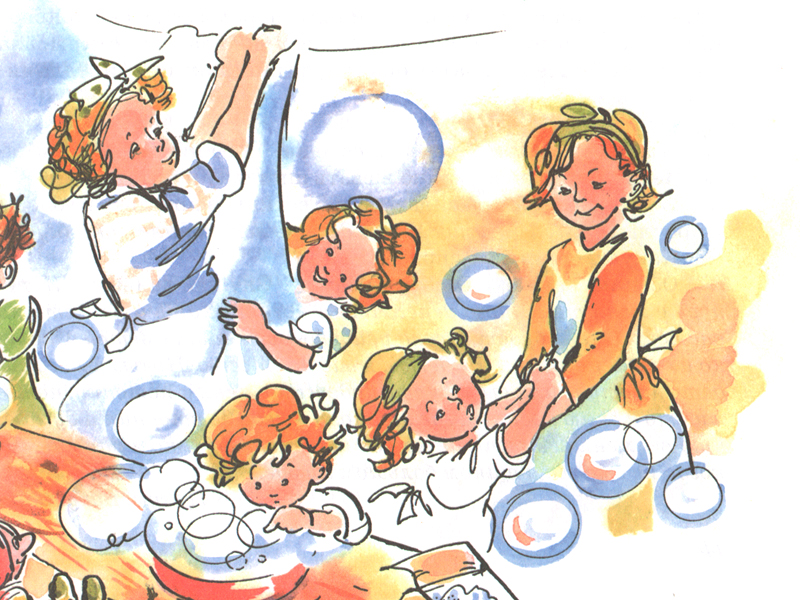 Дети-читатели с первых страниц с удивлением замечают, что восемь детей из книжки всегда веселы и изобретательны в играх, несмотря на внешнюю скудость их жизни. А вот их школьный приятель Сигурд, у которого – о чудо! – есть своя собственная комната и много всяких интересных вещей, не знает, чем себя занять, и с удовольствием веселится с ними вместе на детском празднике, который устроили для них папа и мама. В той самой одной-единственной на всех комнате, превращенной на пару часов в корабль – со сходнями из гладильной доски и парусом, сшитым на скорую руку из восьми детских простыней. Вот в чем все дело, вот один из секретов счастья этой семьи – взрослые и дети стремятся друг к другу, им хорошо вместе. Взрослые умеют и любят играть со своими детьми, а дети не отделены от повседневных забот своих родителей. Маленькие читатели очень быстро замечают душевную щедрость взрослых героев книжки, которые запросто делятся своим временем и силами, не отговариваясь усталостью или недосугом, хотя работают целый день не покладая рук. Как это, к сожалению, не похоже на повседневную реальность жизни современного ребенка, часто предоставленного самому себе или переданного любящими, но очень занятыми родителями под опеку няни. Он и вздыхает с завистью – вот бы и мне так…
