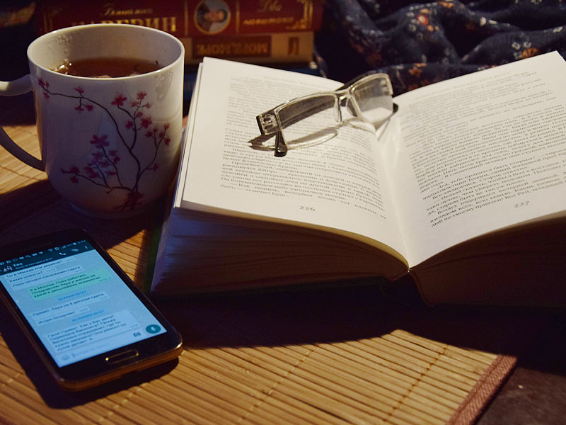 Как это удобно… И как здорово. Настоящая примета времени – все общаются через разные мессенджеры. Экономят время и деньги. Обсуждать можно что угодно. Например, какие подарки покупать детям на новый год. Или чем лечить горло ребёнку. А можно ‒ и любимые книги. Кидать друг другу ссылки на отзывы и сразу же, через телефон, заказывать книги. Потом посылать друзьям фотографии обложек. Или еще лучше – книги у дивана. А рядом – столик. На нем – кружка чая…