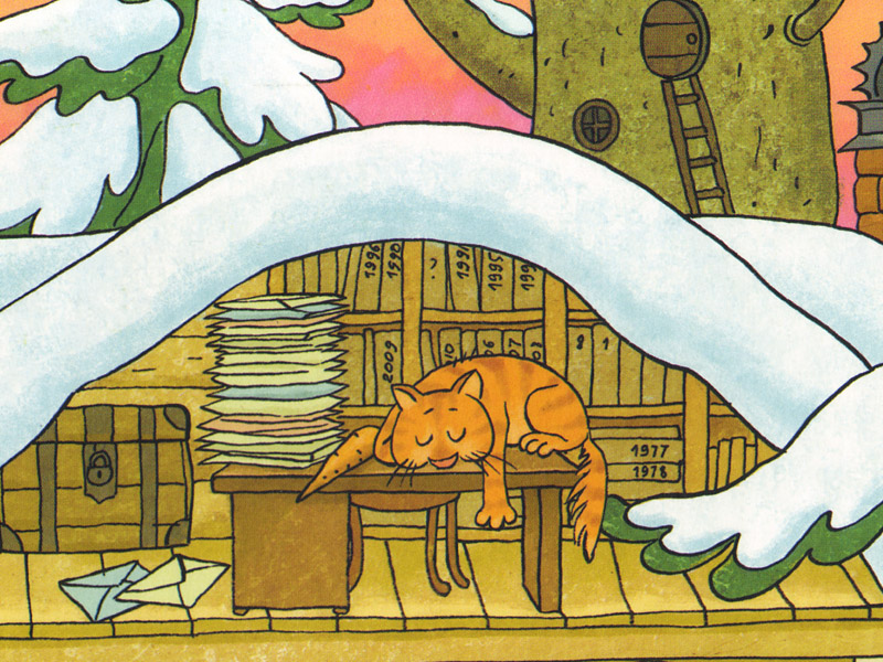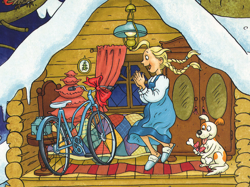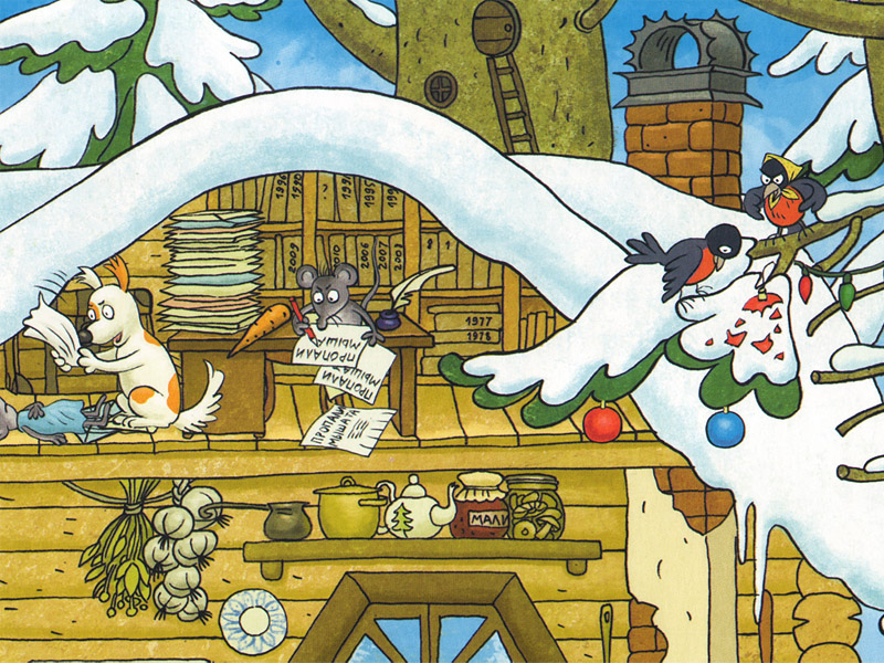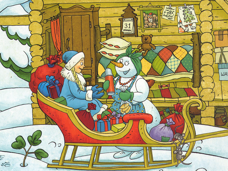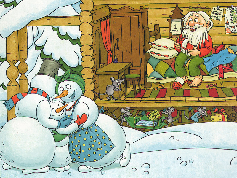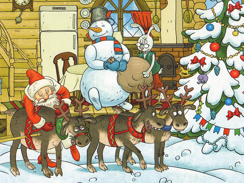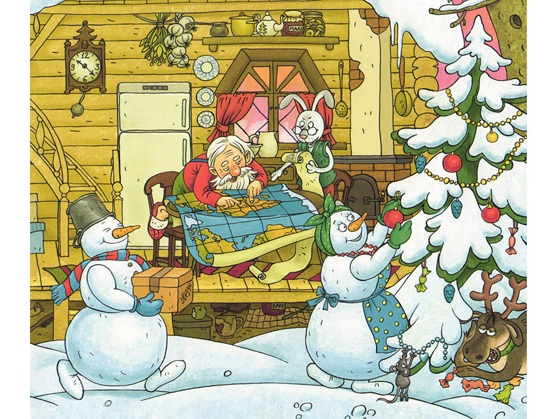 – И вы решили поселить Деда Мороза в уютном деревянном домике, вместе с его «близкими» и друзьями – Снегурочкой, снеговиком, снежной бабой. А домик, нарисованный Ольгой Громовой, очень напоминает домики для игры в куклы. И весь виммельбух как бы вместился в этот домик…