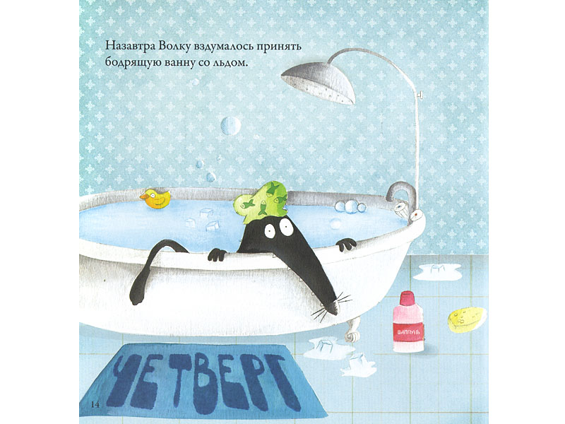 Итак, уставший от однообразия серый волк решает менять цвет в течение семи дней. На каждой странице – новый день недели и новый цвет.