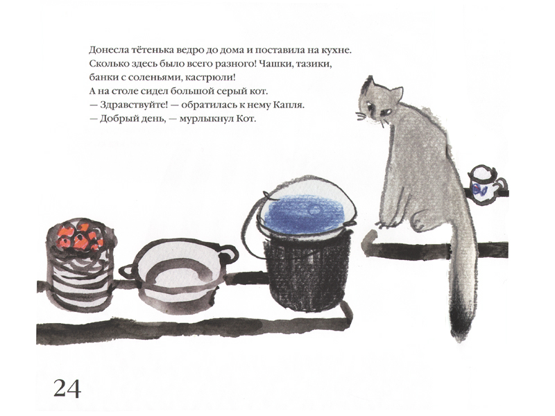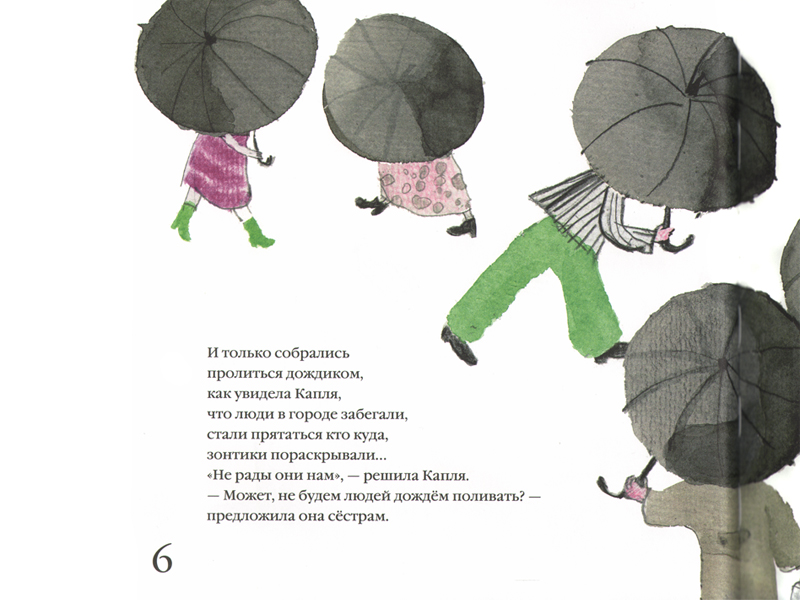 Книга начинается так: «Жила-была на свете капля воды. Прозрачная веселая Капля! Весенним утром летела она по небу вместе со своими сестрами. Капель было так много, что из них получилось настоящее дождевое облако». А на картинке – город: блеклые многоэтажки, крошечные пешеходы, зато транспорт необыкновенной красоты.