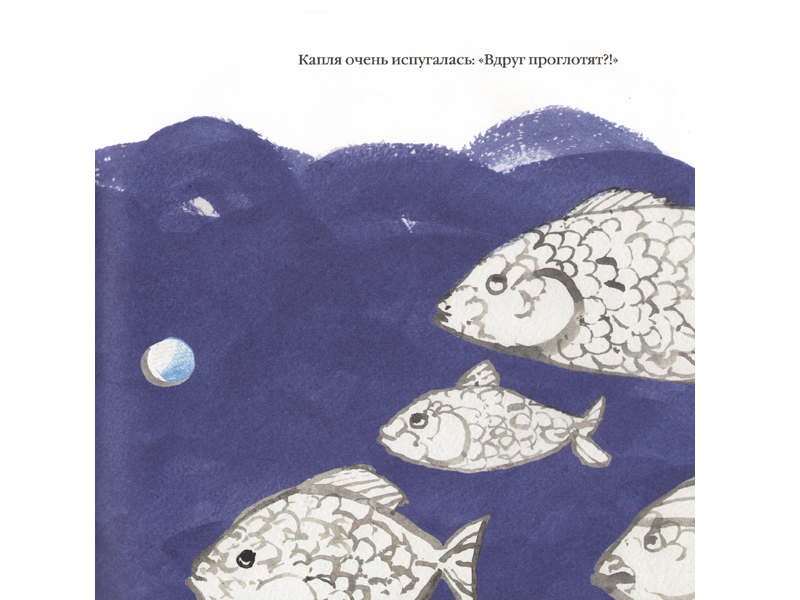 Однако жители города испугались дождя. Тогда капли полетели дальше и решили пролиться над океаном. «В океане плавали рыбы и слушали, как идет дождь…»
