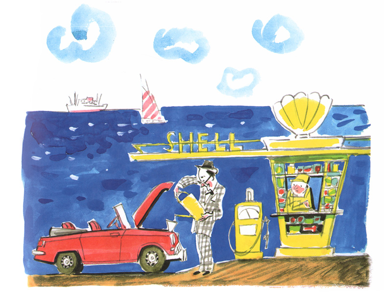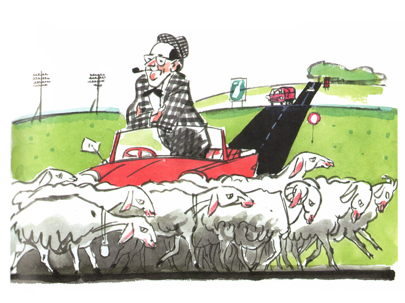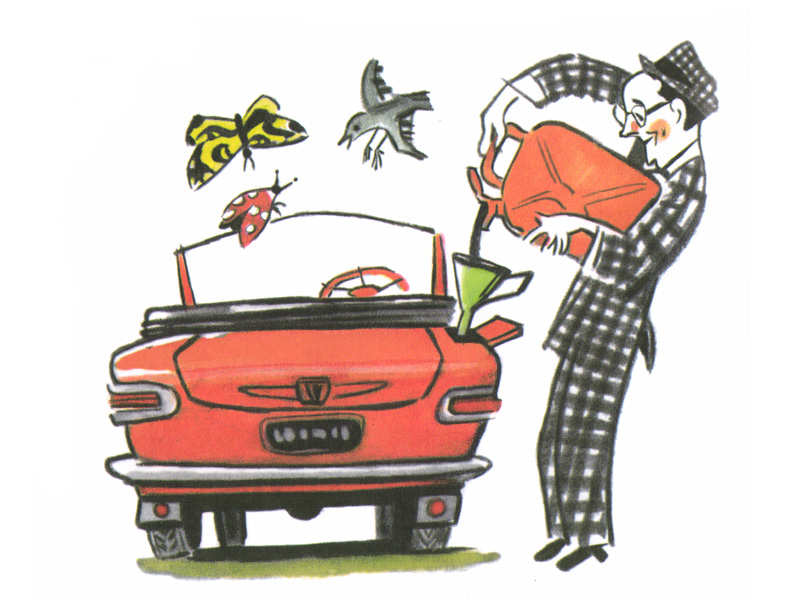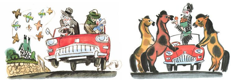 А вот художник М. Скобелев рассказал в этой книге другую историю – динамичную, выразительную, по-своему изысканную, но совершенно другую (книга переиздана с советскими иллюстрациями 1973 года). Автомобильчик у него лишен каких бы то ни было признаков антропоморфности. Он очень похож на большие игрушечные машины, в которые ребенок пяти-шести лет мог сесть и которые приводились в движение с помощью педалей под рулем. Вот примерно на таком автомобильчике е и разъезжает персонаж, которого художник сделал главным героем книги: в клетчатом костюме с бабочкой, лысоватый, на голове – шляпа, на носу – очки, неизменная трубка в зубах. Шляпа в зависимости от ситуации съезжает то на затылок, то на лоб. Плечики узкие… Такой фрик-джентльмен, немного напоминающий Чарли Чаплина. Очень симпатичный, очевидно – позитивный. Это он переживает бурю чувств и эмоций по разным поводам, он везет маму с ребенком в больницу, кормит встречных животных яблоками, переправляется вместе с автомобилем через море на пароме… Автомобильчик для художника – не более чем «техническое устройство», неотъемлемая принадлежность полюбившегося ему персонажа-человечка.