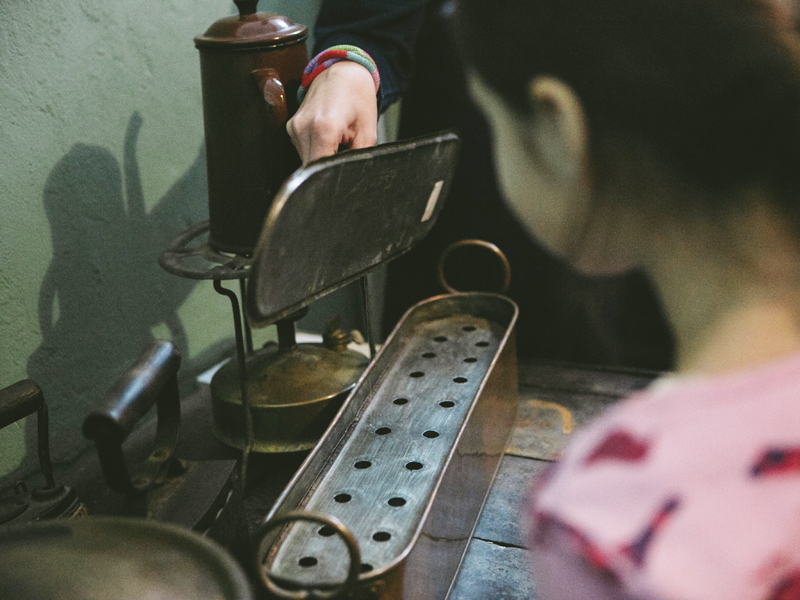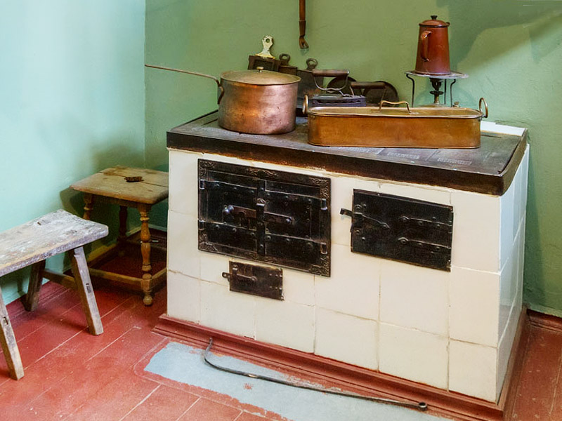На кухне дети разыгрывают импровизационные бытовые сцены с использованием домашней утвари. Предметы самые настоящие, а все остальное воображаемое. Мы затапливаем печь и жарим «яичницу на четыре глаза» на сковородке (не забыть посолить!), перемалываем кофейные зерна в ручной кофемолке и завариваем кофе в кофейнике. Позавтракав, мы занимаемся хозяйством: стираем в тазу и сушим над плитой белье, нагреваем на примусе чугунный утюг и гладим рубашку.