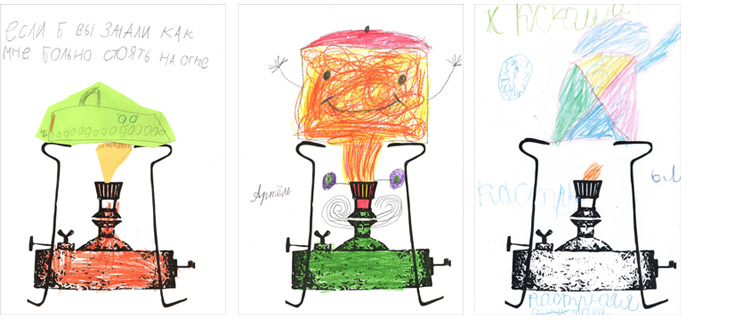 Кто-то в точности повторяет внешний вид старинных предметов, но готовит для родных (варит кисель для мамы, кипятит молоко для младшего брата). Кто-то рисует «живые» вещи: утюг на огне сдерживает слезы, а кастрюля улыбается, потому что ей щекотно. Кто-то фантазирует, как видят мир поэты, и подчеркивает красоту кухонной утвари. Однажды нам нарисовали чайник в разноцветную клеточку.
