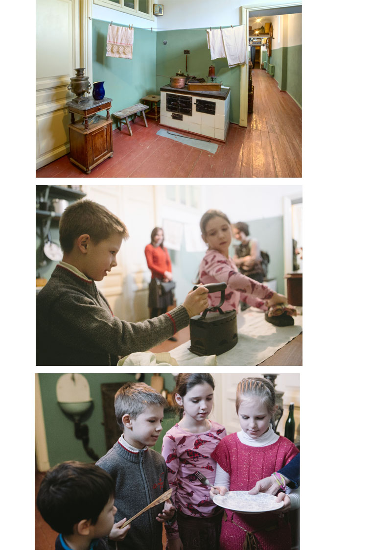 Затем мы отправляемся на кухню в экспозиции музея. Ведущий предупреждает детей, что все кухонные предметы здесь давно спят и никому не служат. Брать в руки можно только специальные вещи для игры. И даже с ними следует обращаться бережно, потому что они живые, умеют говорить и чувствовать.