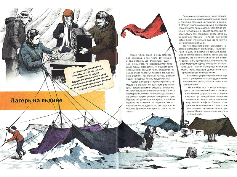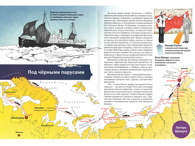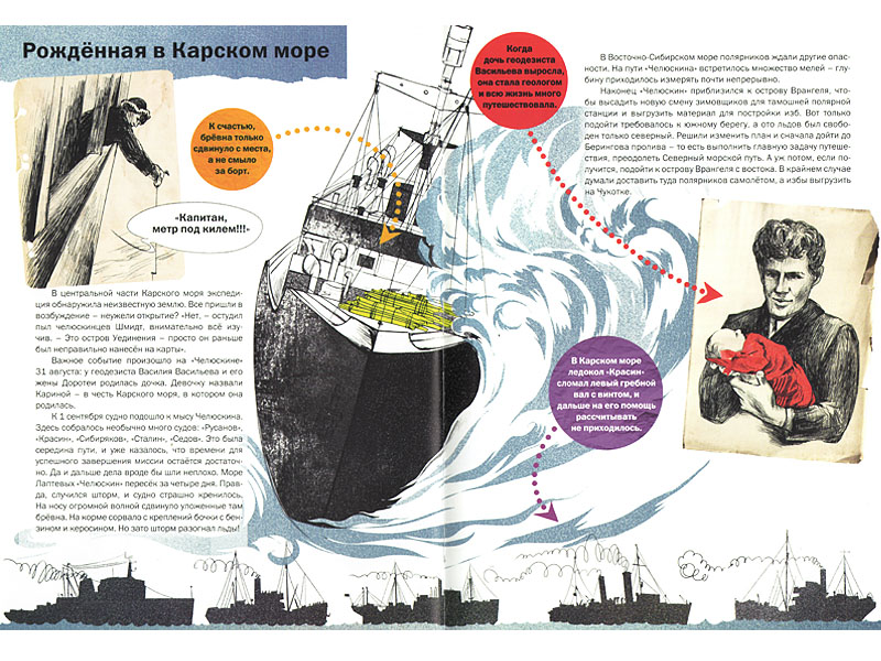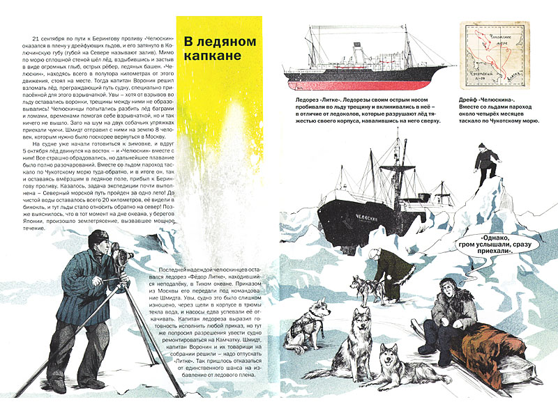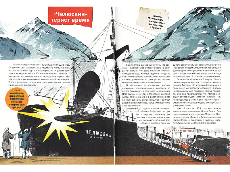 Сына книжка захватила сразу, хотя информационно насыщенный текст был значительно сложнее, чем в книжках-картинках того же издательства. Но в нем то и дело попадались забавные факты, которые, по-моему, сыграли роль своеобразных маячков, помогавших с легкостью продвигаться сквозь текст. Например, неожиданное упоминание о годовалой дочери начальника полярной станции острова Врангель, которую родители взяли с собой на зимовку, или еще более необычная история – о рождении прямо на борту «Челюскина» девочки Карины, дочери одного из членов экипажа, названной в честь Карского моря, в водах которого она родилась. Или рассказ о коровах и свиньях, взятых на борт, чтобы полярники не заболели без мяса опасной северной болезнью – цингой. Наш впечатлительный восьмилетка моментально вообразил себе эту картинку: темный трюм, наполненный мычаньем и хрюканьем. Чем не кино?
