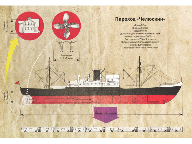Подходящим вариантом оказалась книга «Спасение челюскинцев» (из серии того же издательства «Великие экспедиции»). Для Макара это был совсем неизвестный сюжет. 1934 год, в ста пятидесяти километрах от берега Чукотки терпит крушение раздавленный льдами советский пароход «Челюскин». Книга максимально приспособлена к восприятию читателя младшего школьного возраста. Уже на форзаце, где изображен пароход «Челюскин» и представлены его размеры и прочие технические характеристики, знанием которых так любят козырять друг перед другом мальчишки, все эти сведения даны не только в цифрах, но и в более понятных младшим школьникам житейских «измерителях». Так, длина парохода (92 метра) оказалась равна длине пяти городских автобусов, поставленных в ряд; глубина осадки судна (6,5 метра) равна высоте стандартного двухэтажного коттеджа. Все это нарисовано тут же, рядом с чертежом судна, предельно наглядно. И конечно, как полагается в книгах-путешествиях, здесь есть карта, на которой помечены стоянки «Челюскина» с указанием даты. Читая книгу, можно находить каждый раз соответствующую точку на карте. («О, вот это подходяще начало сложной темы!» – подумала я.)