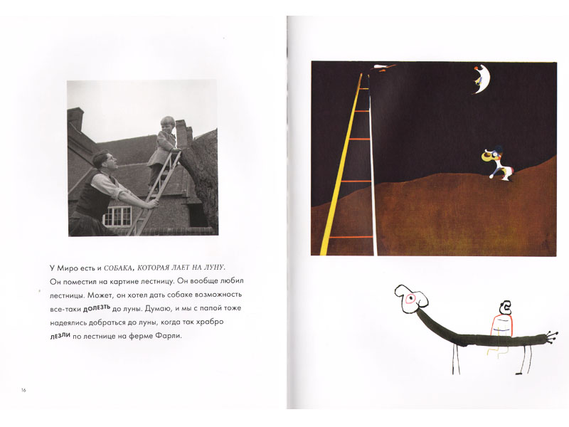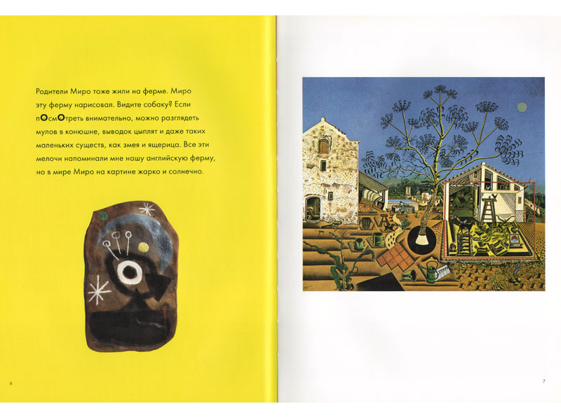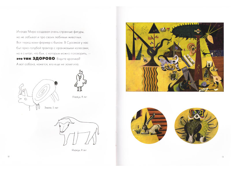 Книги Энтони Пенроуза «Миро и его волшебные животные» и «Мальчик, который укусил Пикассо» – блестящий пример такой «настройки». Конечно, это не обычные книги, а специальные книги по искусству, адресованные детям. Но это всего лишь означает, что задача подготовить ребенка-читателя к восприятию произведений живописи и графики решается здесь прямо. Картины больших и сложных художников в книгах Пенроуза являются и предметом повествования, и иллюстрациями. И на примере этих книг очень ясно видно, как на первый взгляд непонятное попадает в сферу детского восприятия – с помощью текста. Текст организован так, что работы художников оказываются встроенными в контекст, понятный и интересный ребенку (примерно лет с шести), и вместе с этим контекстом «оседают» в его памяти и делаются «своими».