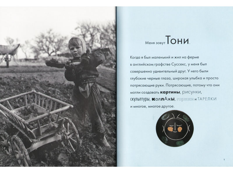 Понятность, немногословность и «домашняя» событийность историй, которые рассказывает Энтони Пенроуз, – это мостик, по которому автор проводит ребенка-читателя к картинам больших художников ‒ на самом деле очень сложных. Картины в его книгах не случайно соседствуют с фотографиями – они даже как бы «вырастают» из них. Вот фотографии животных лондонского зоопарка, а вот – кажущиеся фантастическими животные Миро. Вот фотография мамы Энтони, а вот ее портрет работы Пикассо. А вот так разные вещи невообразимым образом превращались в части скульптур Пикассо: «Приглядитесь-ка к лицу мамы-обезьянки. Видите, из чего оно? Из игрушечной машинки Клода!» (Клод – сын Пикассо).