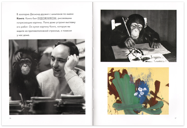 Иными словами, читать эти книги с детьми – великое удовольствие. (Взрослого это тоже продвигает в искусстве.) И листать – удовольствие. Не только из-за интересных репродукций и фотографий, но и из-за того дизайнерского мастерства, с которым выполнен макет книги. Тут работает все – и цвет страниц, и ритм больших и маленьких картинок, и неожиданные изобразительные «движения» шрифта.