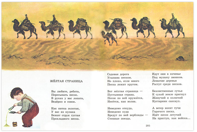Младший сынишка и сейчас, в 2 года и 10 месяцев, не мыслит громкую читку без стихотворений «Вот какой рассеянный» и «Багаж». Среди иллюстраций мы нашли и изображение мальчика, похожего на Федю. Он с сосредоточенным видом сыплет песочек в ведерко на картинке к «Желтой странице» «Разноцветной книги»: