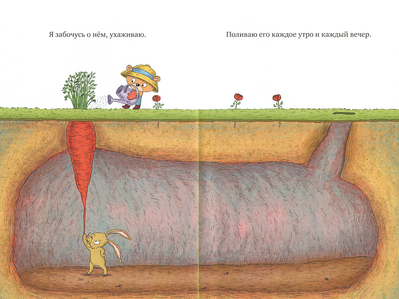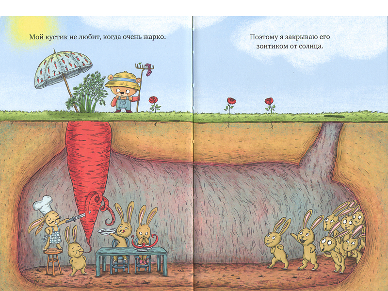 Книга про маленького садовника и «неопознанный» куст имеет двойное дно. В буквальном смысле: в ней одновременно рассказывается две истории. Одна – «надземная». Я уже ее описала. А другая – «подземная», представляющая собой параллельный сюжет без слов, историю в картинках. В нижней части книги изображена большущая кроличья нора, внутрь которой опрометчиво прорастает морковка. И там действует орава буйных прожорливых кроликов. Им нет никакого дела до интеллектуальных метаний медвежонка. И если их посетило удивление по поводу физических характеристик морковки, то оно почти сразу сменяется желанием ее съесть. Кролики весело и «кровожадно» лопают морковку – до боли в своих жадных кроличьих животах. Им в голову не приходит, что морковка чужая. Какая же она чужая, если она вот тут, в норе, прямо у них перед носом? Что-то вроде возмездия настигает их только тогда, когда неудачливый, погруженный в рассуждения медвежонок решается вытянуть куст из земли, чтобы выяснить причины «порчи»: почему его куст не цветет? В этот момент в кроличьей норе случается небольшой обвал и образуется незапланированная дырка в потолке. Но в целом – ничего особенно ужасного. Что касается медвежонка, то он, целиком поглощенный стремлением к красоте, вполне удовлетворен открывшимся ему зрелищем – огрызком морковки. Огрызок, если найти ему правильное положение, чем-то напоминает розу…