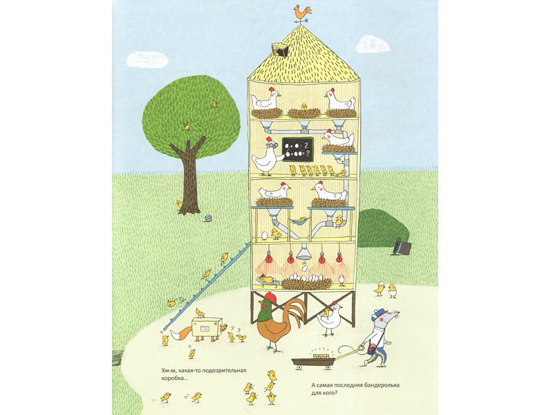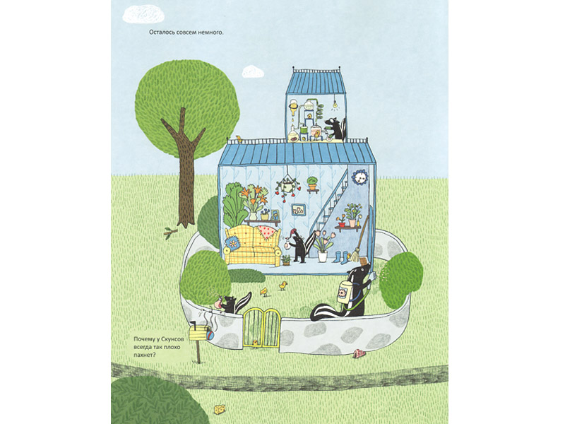 Так мы дочитали до конца. Побывали у скунсов (Лева не знал, почему у них невкусно пахнет, поэтому не понял шутку художника ‒ они все опрыскивают ароматизаторами), посмеялись на странице с Йети (потому что у нас машина «Йети»), поволновались за кур, к которым хитрая лиса пробралась в виде посылки ‒ «доставила» себя прямо в курятник.