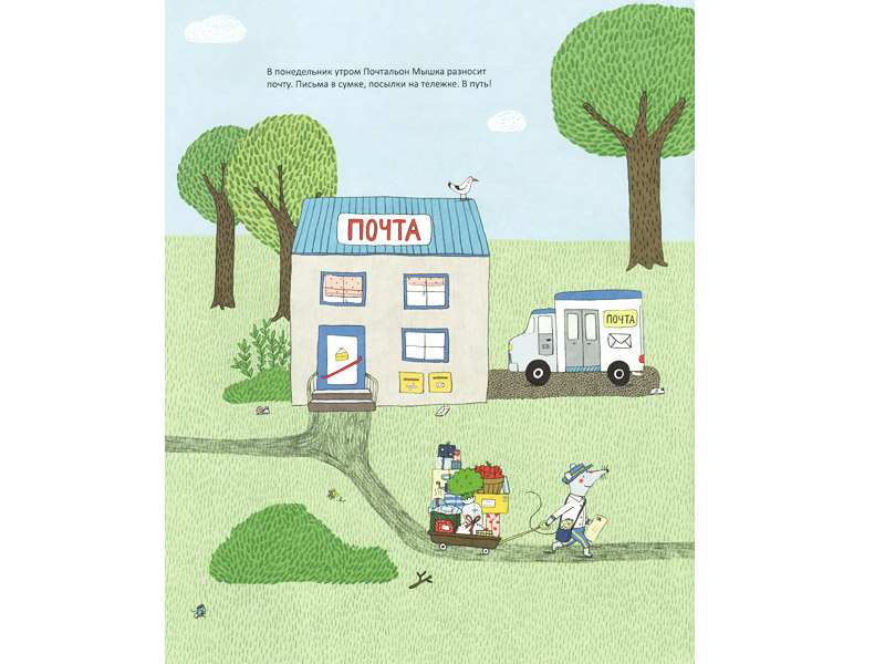 «Почтальон Мышка» Марианны Дюбюк стал для меня ярким подтверждением того, что зачастую родители, выбирая книги для ребенка, на самом деле выбирают книги самим себе. Когда я начала мечтать об этой книге, Леве было уже шесть лет, и я знала, что объективно он из этой книжки-картинки уже вырос. Но у «Почтальона Мышки» есть секретное оружие, которое мгновенно и навсегда влюбляет в эту книгу ‒ это дома (а также норы, гнезда и подводные жилища) в разрезе. Поэтому, невзирая на Левин солидный возраст, я поняла, что книга эта нам остро необходима.