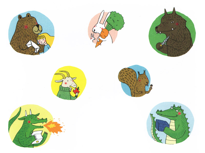 Приятно удивило то, что неленивый детский ум сам себе придумывает задачи даже там, где взрослые (ни автор, ни сидящий рядом взрослый) их и не подразумевали. Или, во всяком случае, не настаивали и не предлагали в виде сформулированных заданий. К примеру, на титульном листе изображены портреты героев: медведь, кролик, белка, дракон. Лева абсолютно по собственной инициативе пронумеровал их, причем в какой то загадочной для меня последовательности. Как выяснилось, он их расположил в том порядке, в котором почтальон Мышка по ходу повествования вручает им посылки и бандероли.