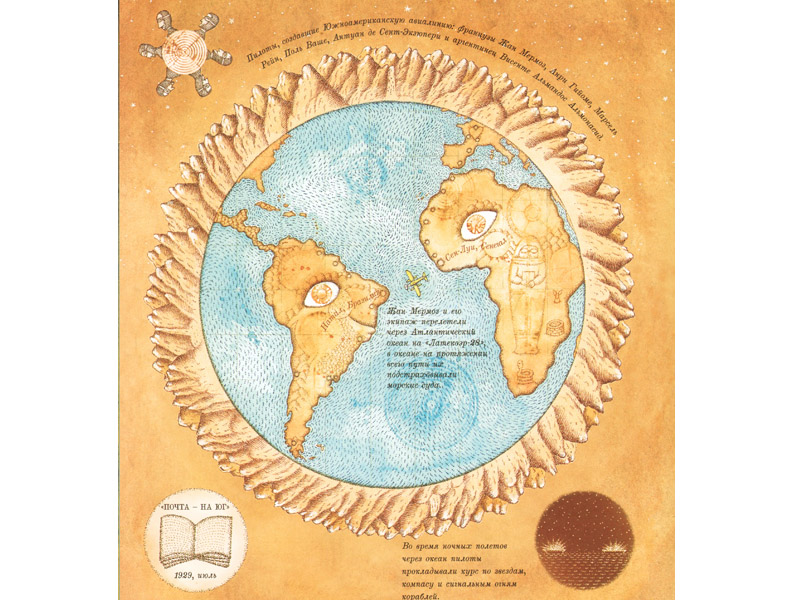 На форзаце книги самолет облетает земной шар, а за ним тянется след-шлейф из букв и слов. Яркая метафора жизни Экзюпери. В исполнении Петра Сиса история ранней авиации, летчика и писателя становится очень наглядной.
