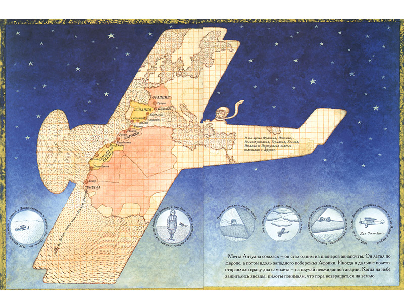 Хотя в книжке приведено множество фактов, это не только биография реального писателя, но и сказка об Антуане, который мечтал, летал, писал книги. Мифологизация – один из основных инструментов Петра Сиса. Это «книжка-триплан», у которой, как у популярных во времена зарождения авиации самолетов, три крыла, три поверхности, создающих подъемную силу: иллюстрации; простой текст – несколько строчек на каждой странице; текст, набранный мелким шрифтом. Метафорически автор выразил это в посвящении в начале книги: