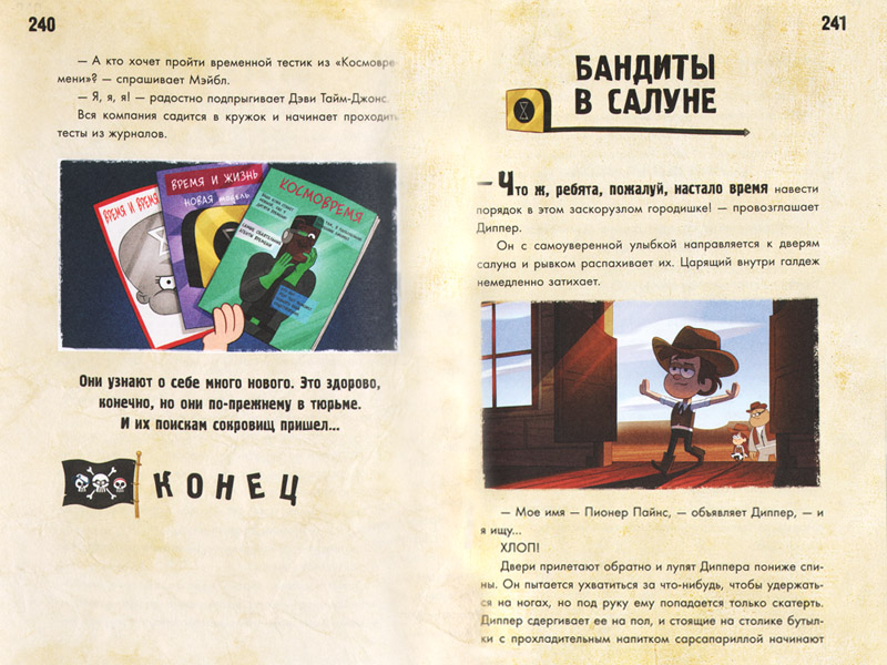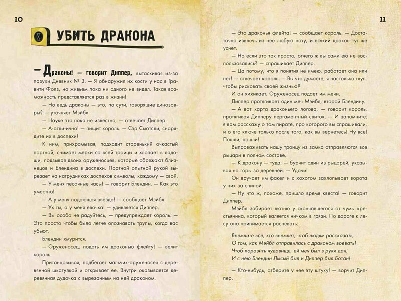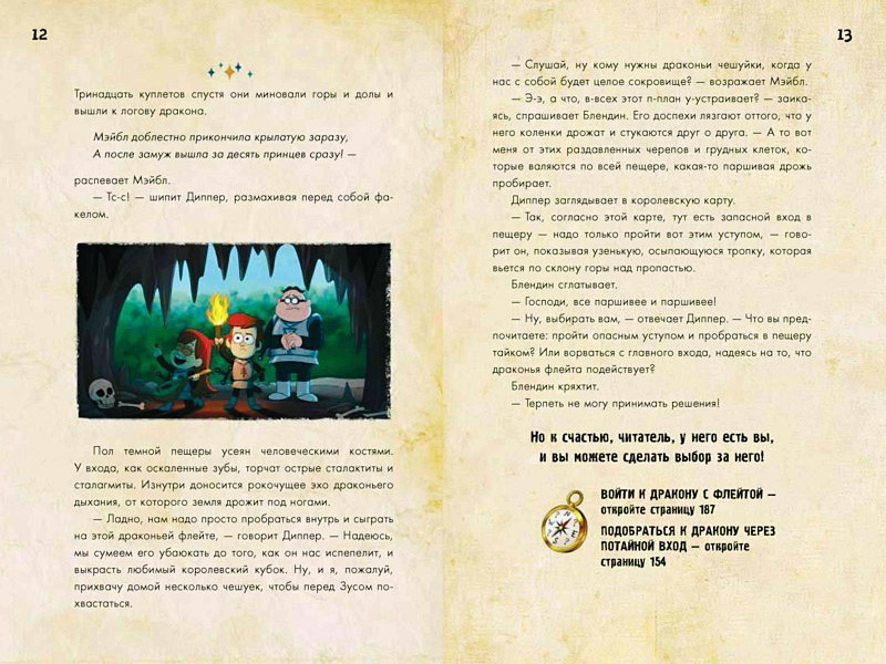 Вы здесь не послушно следуете за автором, а сами управляете повествованием. Отправиться на Дикий Запад или в далёкое будущее? Сразиться с драконом или поговорить с ним по душам? Будьте осторожны – решения нужно принимать почти на каждом шагу! Вариантов развития сюжетного квеста столько, что с первого раза осилит все только истинный фанат «Гравити Фолз» или читатель с железной силой воли. Если вы не причисляете себя ни к той ни к другой категории, то вам все равно будет безумно интересно разгадывать неожиданные повороты. Специально для вас маленький спойлер: самые разумные решения здесь далеко не всегда самые правильные. Выбирайте самое безумное, и тогда вас ждёт успех!
